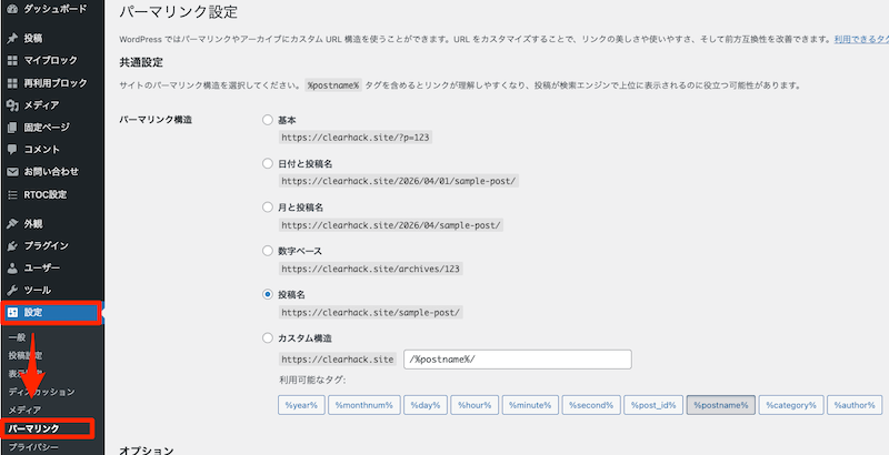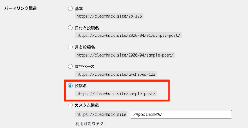 「投稿名」を選ぶと、https://あなたのドメイン/記事のスラッグ/ というシンプルなURL構造になります。